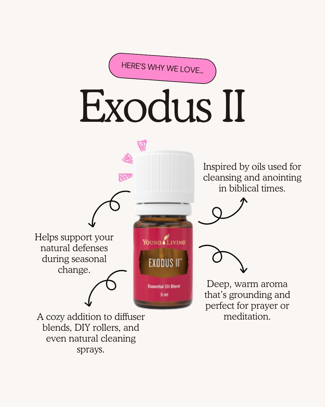 Exodus II is your go-to when you want to feel rooted, clear, and supported. It helps cleanse both your physical and emotional space, making it the perfect blend to diffuse while you reset your day, journal, or pray. A drop in the palms before deep breathing brings instant calm and focus. It’s also a wonderful oil to keep in your wellness toolkit for immune and respiratory support when the air turns crisp!